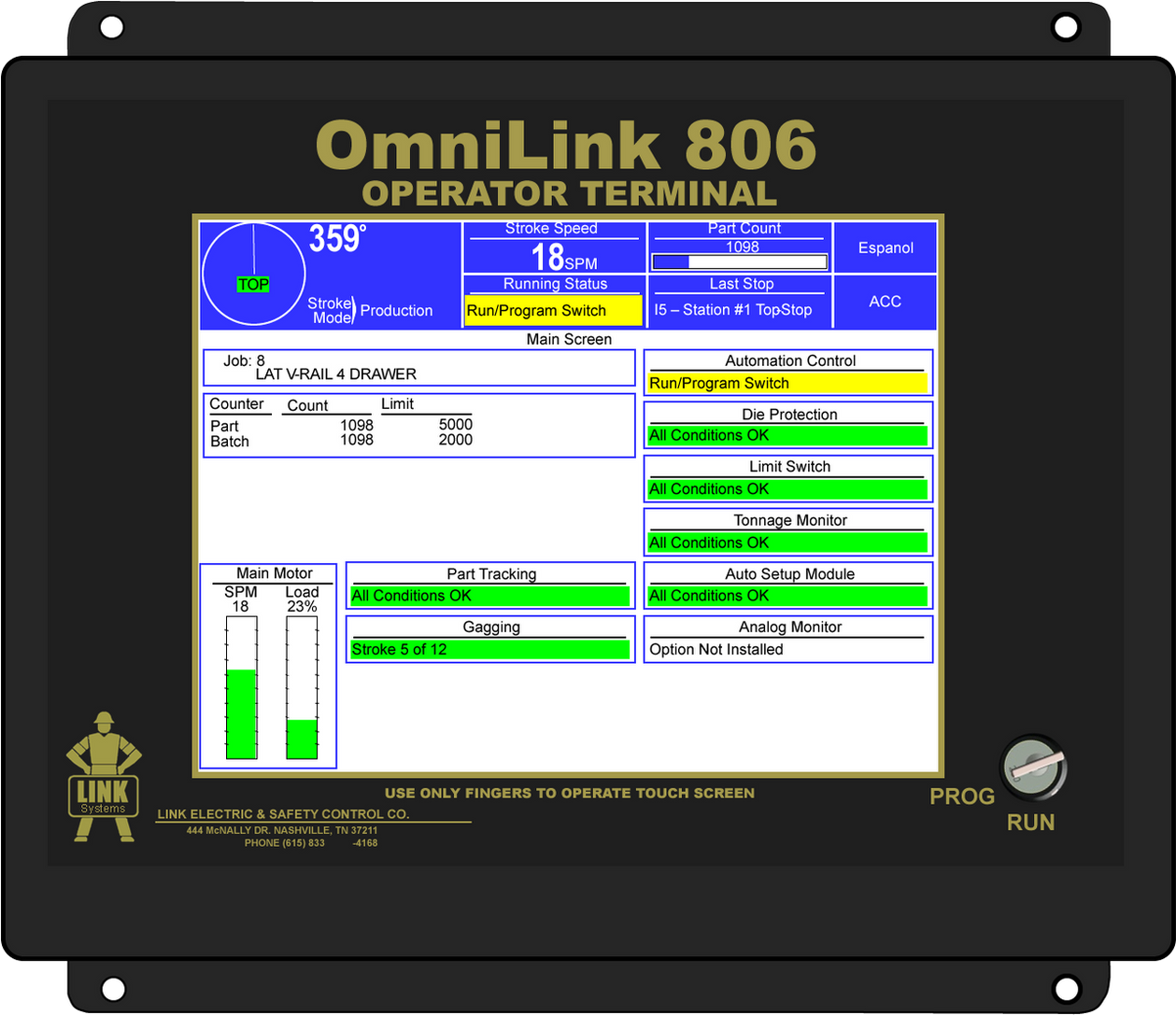 The Link 5100-AMC Automation Control integrates with any existing press control. It uses the 806 Operator Terminal to integrate the 5100 modules for die protection and process monitoring, programmable limit switches, tonnage and signature monitoring, automatic setup, and provides multiple communication interfaces. Control, sequence, monitor, and diagnose automation used with press production systems.